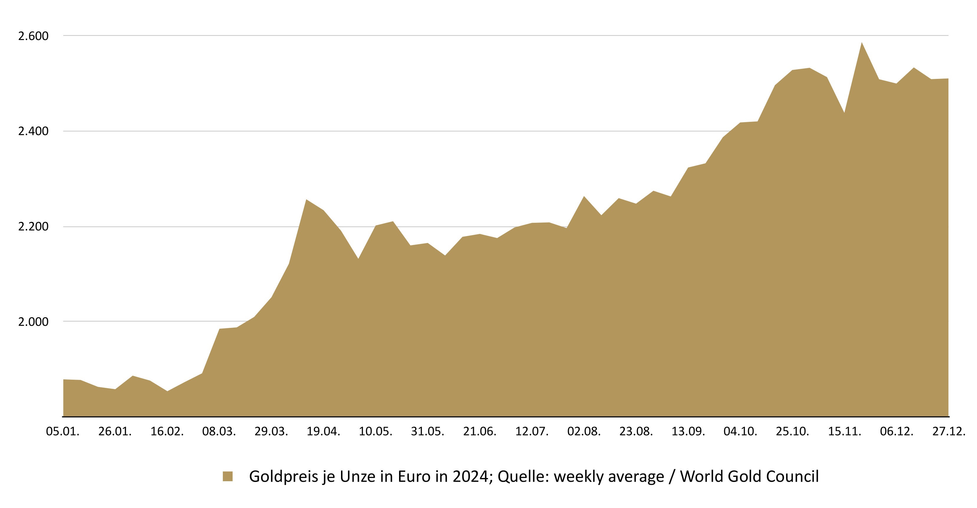 Wenn ich richtig gezählt habe, haben wir 2024 insgesamt 30 Mal ein neues Alltime-High verzeichnet, also ein neues Allzeithoch für den Goldkurs in Euro. Das zeigt, dass der Wertzuwachs in Sprüngen erfolgte, in denen der Kurs auf externe Faktoren reagierte. Nicht immer unbedingt auf die Nachfrage, sondern eher auf die Nachrichten.